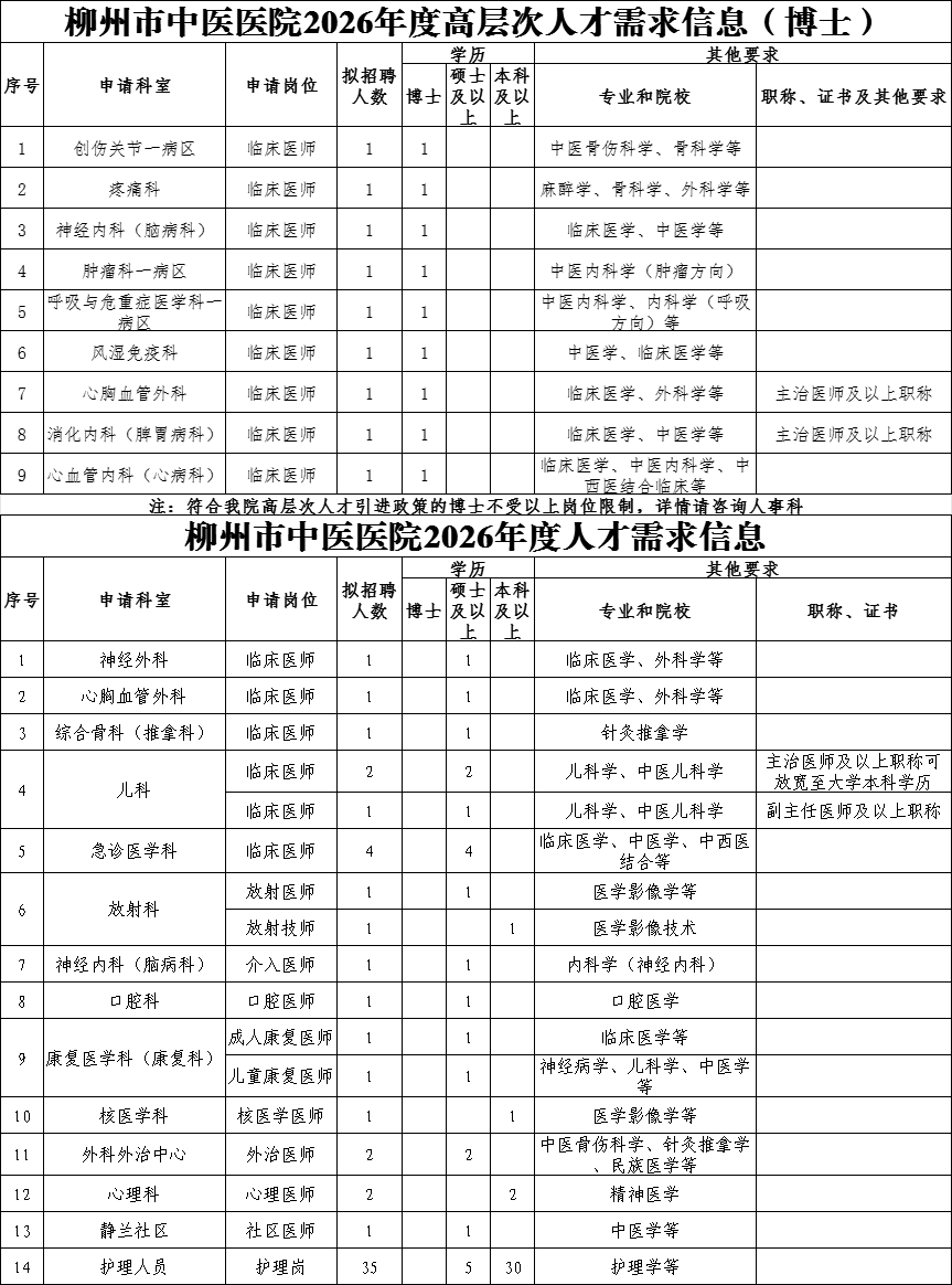 高層次人才不受招聘崗位限制,均可一事一議、一人一議。高層次人才(博士)根據(jù)醫(yī)院引進(jìn)人才制度,給予25萬-120萬元安家費(fèi)、5萬-20萬元科研啟動(dòng)經(jīng)費(fèi)。引進(jìn)的高層次人才(高級(jí)職稱或博士研究生)按柳州市有關(guān)政策提供事業(yè)編制,協(xié)助其解決子女入學(xué)和配偶工作。2026年醫(yī)學(xué)類緊缺人才擬招聘醫(yī)師7人,緊缺人才科室為心理科(精神衛(wèi)生專業(yè))、神經(jīng)外科、急診醫(yī)學(xué)科,擬享受柳州市中醫(yī)醫(yī)院人才引進(jìn)醫(yī)學(xué)類緊缺人才安家費(fèi)2-20萬元,同時(shí)按照國家、廣西壯族自治區(qū)、柳州市及醫(yī)院有關(guān)政策享受工資及福利待遇,獎(jiǎng)勵(lì)性績效工資按照醫(yī)院同級(jí)同類人員規(guī)定執(zhí)行。如為學(xué)科帶頭人或高層次人才則另按其標(biāo)準(zhǔn)享受相關(guān)待遇。